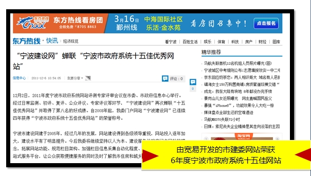 2009年度由我公司(宽易天地信息科技有限公司)开发的市建委网站荣获宁波市政府系统十五佳网站