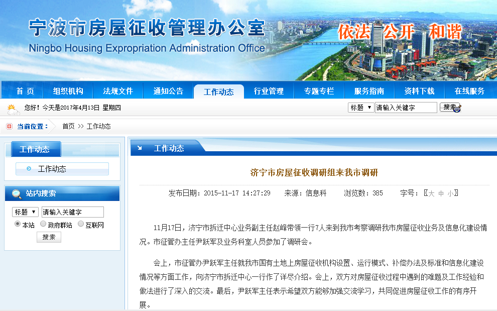 继宁波市国有土地上房屋征收管理信息系统取得巨大成功后, 2015年11月17日济宁市拆迁中心业务副主任赵峰带领一行7人来到我市考察调研我市房屋征收业务及信息化建设情况。