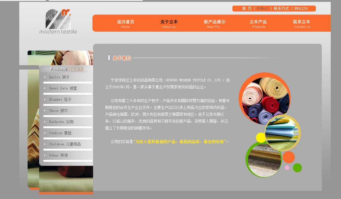 宁波保税区立丰纺织品有限公司(NINGBO MODERN TEXTILE CO.,LTD.)成立于2002年1月,是一家从事于集生产贸易家用纺织品的企业。